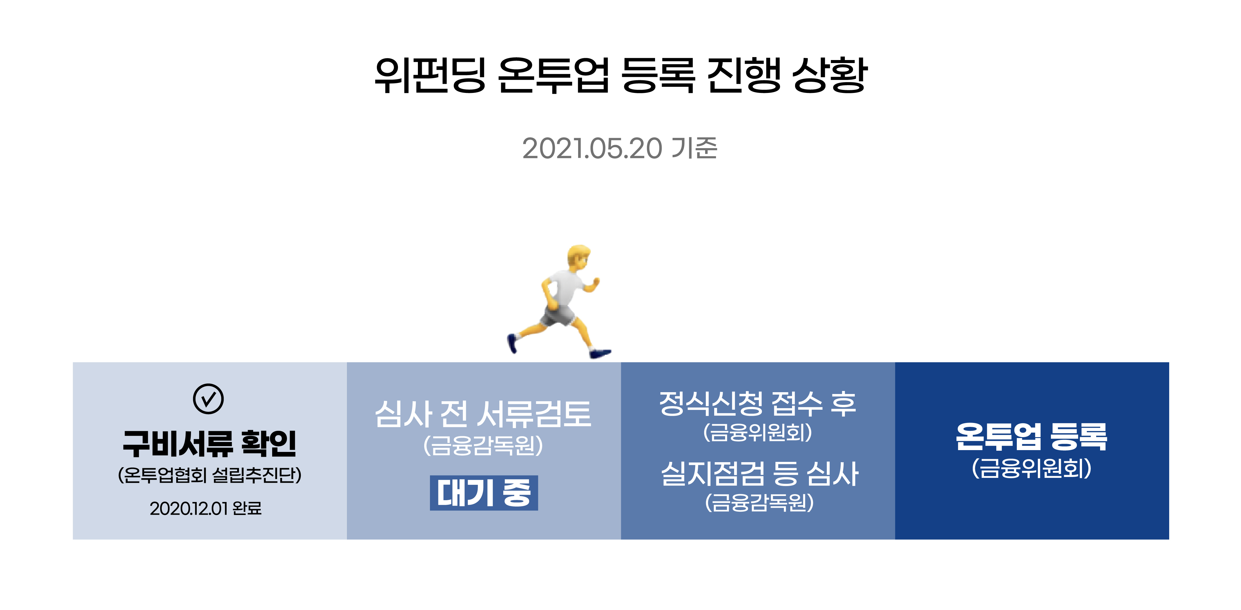 현재 온투업 등록을 위해서는 아래의 4단계를 거쳐야 하며, 저희 위펀딩은 현재 2단계 접수 대기중입니다.