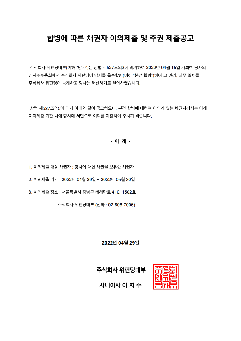 주식회사 위펀딩대부 합병에 따른 채권자 이의제출 및 주권 제출공고